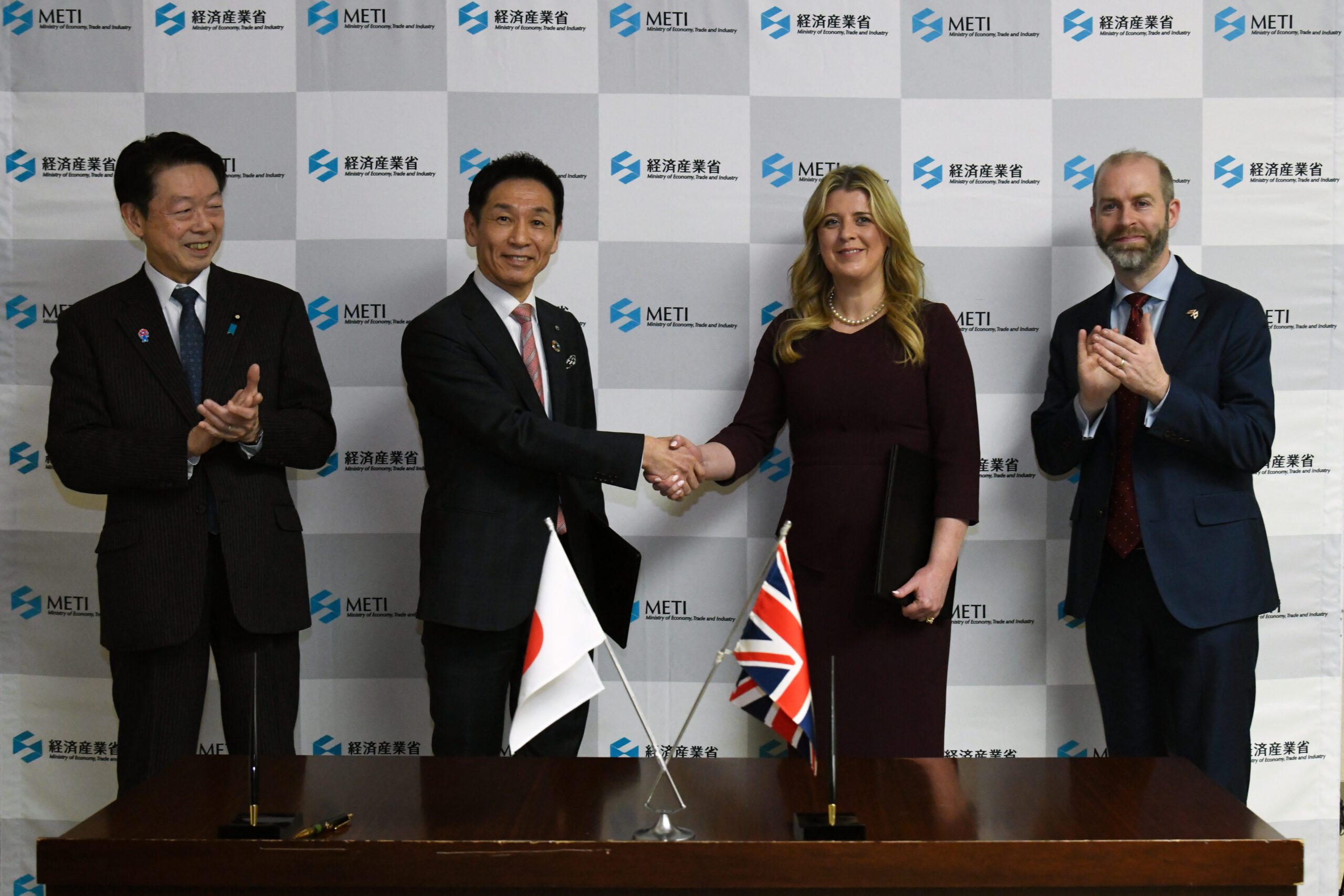 (写真:日本・武藤経済産業大臣、当組合理事長・寺﨑正勝、ORE Catapult役員・クリスティーナ・ガルシア=ダフィー氏、英国・レイノルズ ビジネス貿易大臣)