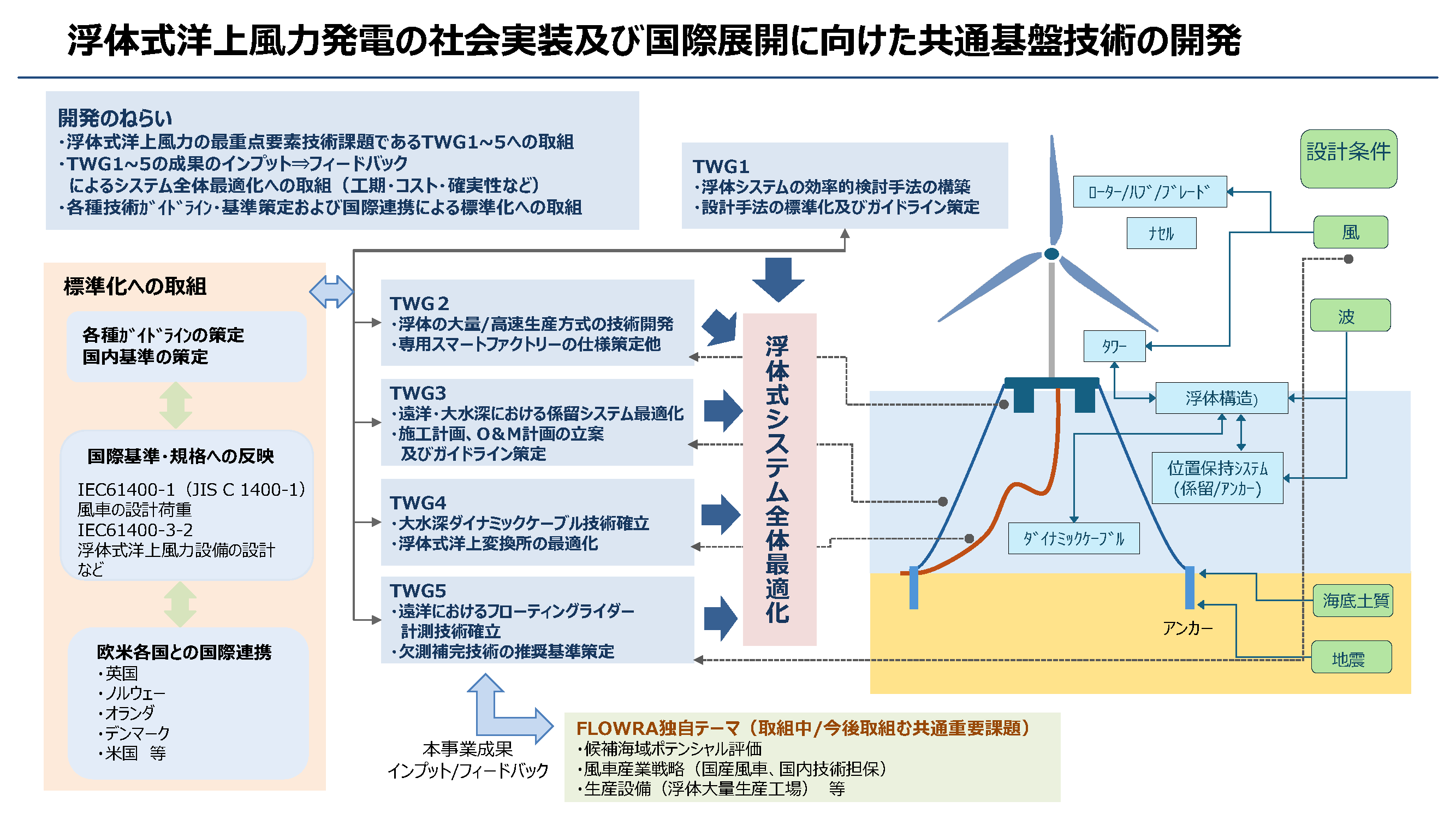 本事業は、浮体式洋上風力の共通基盤技術のうち最重要課題である以下の5つのテーマに取組み、浮体システムの全体最適を目指すとともに、国際展開に向けて欧米等各国との連携による基準の策定、標準化に向けた準備にも取り組んでまいります。